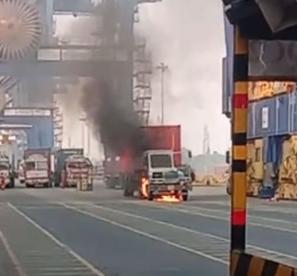 3月2日晚上,一辆装满集装箱的卡车在印度纳瓦谢瓦港(JNPA)的码头起火。