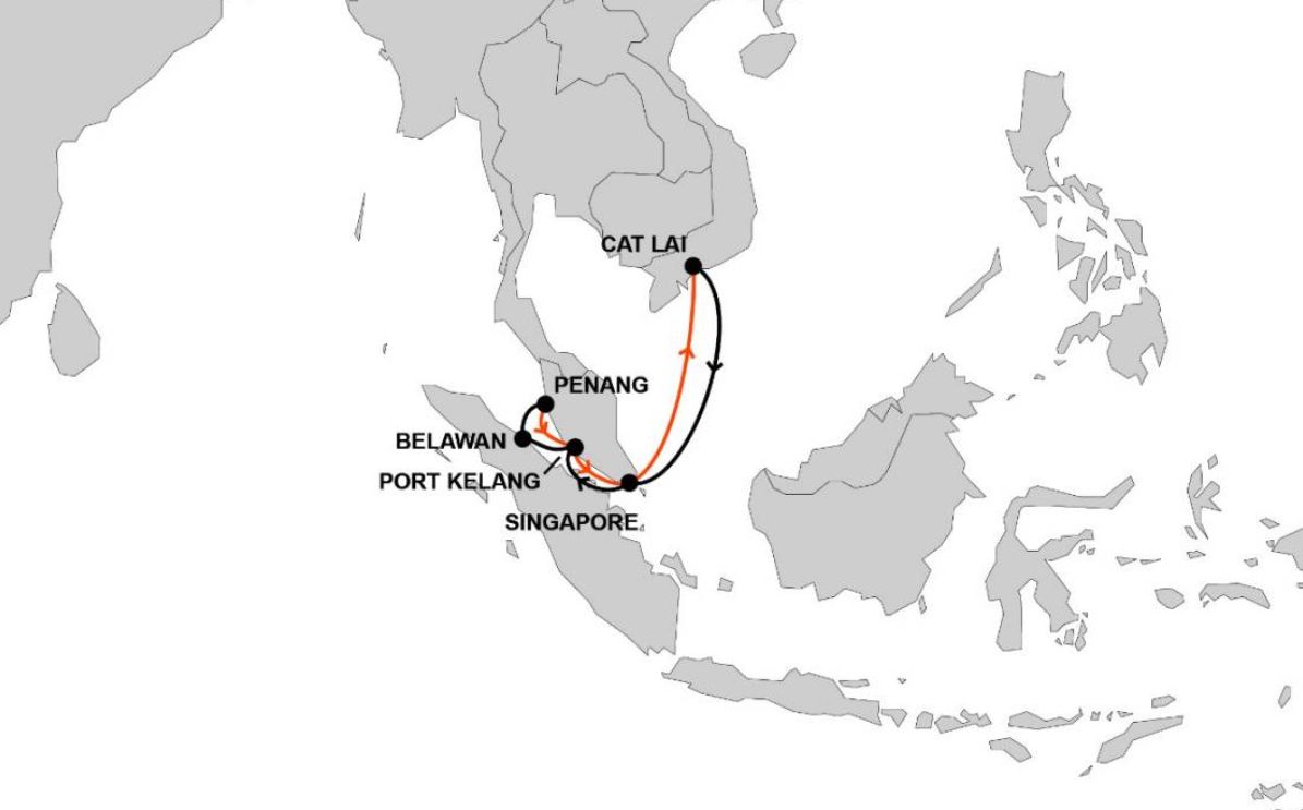 新航线将依次为凯莱港(越南)-新加坡-巴生港(马来西亚)-比拉湾(印度尼西亚)-槟城(印度尼西亚)-巴生港-新加坡-凯莱港。