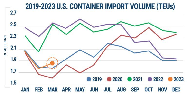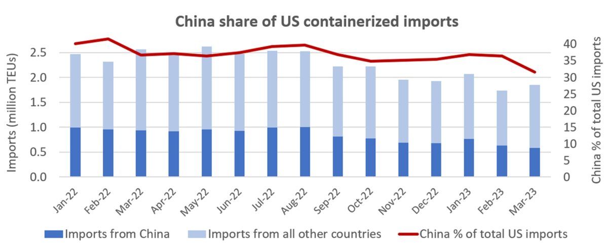 3月份美国从中国的进口总额为586,129标准箱,较2022年8月的近期高点暴跌41.6%。(同期美国进口总额下降了26.7%。)