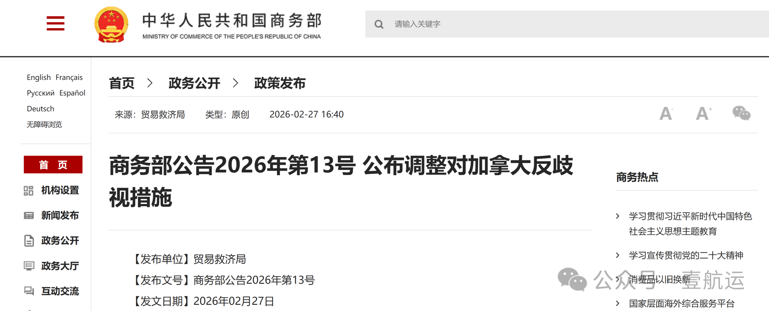 2月27日下午,中国商务部发布公告,宣布调整对加拿大反歧视措施。