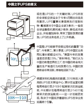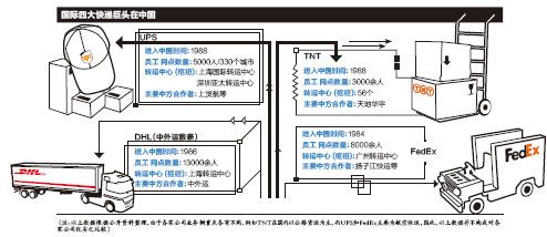 对照之下,UPS在牌照和网络方面皆无资源优势。没有中方合作对象;虽然网络可以遍布330个城市,但是拥有5000多名员工的UPS中国区,其员工总数远少于FedEx(约8000名员工)和DHL(约13000名员工);在速递业的网络末端,仍需要大量人力投入。为此,2010年初,UPS中国区新增了101个分拨中心,加强网络布局。
