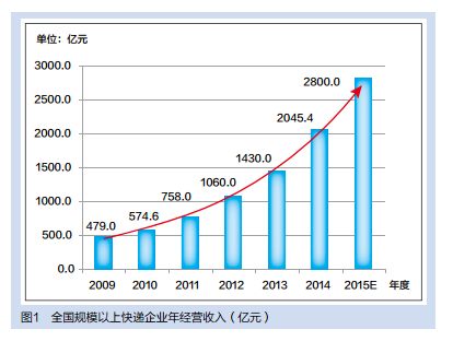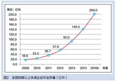 “十二五”期间快递业持续增长,连创新高。国家邮政局统计显示,2013 年快递业务量达 92 亿件,提前两年实现了“十二五”达到 80 亿件的目标,当年超过日本成为全球第二大快递市场。2014 年快递业务量达 140 亿件,超过美国成为世界第一。预计 2015 年业务量将超 200 亿件,将是“十二五”首年业务量的 5 倍,继续居世界第一。快递业从 2012 年起市场规模就达千亿元,2013 年快递业务收入 1441.7 亿元,同样提前2年实现了 “十二五”1400 亿元的目标;2014年是 2045.4 亿元。2015 年受国际市场低迷、国民经济下行压力加大的影响,传统邮政业务继续下降,快递业务增速也放缓了,但电商主渠道作用增强,预计快递业收入将达 2800 亿元。“十二五”时期,快递业实现了跨越式发展。(参见图 1、图 2)