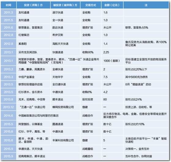 “十二五”期间快递业参与金融与资本市场的密集投资,由两方面促成。一是国家推进金融改革,政策放宽投融资限制,加大了金融和资本市场对实体经济的支持力度,物流资金渠道日益多元化、市场化。例如,2012 年国家发改委等 12 部委联合下发了《关于鼓励和引导民间资本进入物流领域的实施意见》,吸引了众多中外民间资本投资国内快递等各类物流企业,我国逐步迈入了股权投资时代。二是大中型快递企业为适应消费升级的市场变化和快递业以提高效益、服务质量为新导向的需要,加快了转型升级,由原来单一的劳动密集型快递企业向技术、资本与劳动密集型结合的综合物流供应商的方向发展,凸显了对资金的刚性需求。民营快递借助资本市场,实现了资本运作、股权置换、兼并重组、战略合作等,缓解了企业资金困难,提高了市场核心竞争力。快递业的资本运作好戏连台(参见表 1)。此外,EMS、申通、顺丰、圆通、中通、韵达、宅急送、全峰等快递企业都在积极酝酿上市。