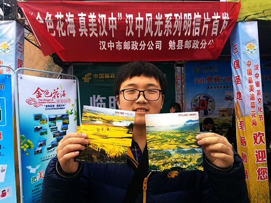 同日,2018年最美油菜花海活动启动仪式在汉中勉县举行,在汉中市邮政管理局的支持下,汉中市邮政分公司将10个区县的旅游景点印成风光系列明信片1套20枚,现场设立临时邮局,向游客免费赠送,宣传乡村旅游。