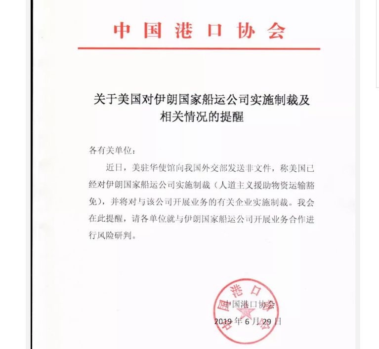 6月29日,中国港口协会发出关于美国对伊朗国家船运公司实施制裁及相关情况的提醒。