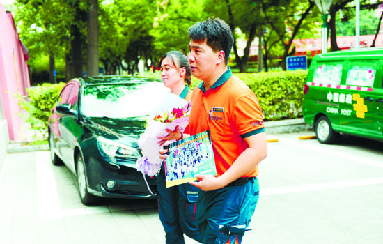 刘诗懿在投递员的陪同下写下对自己未来的寄语。