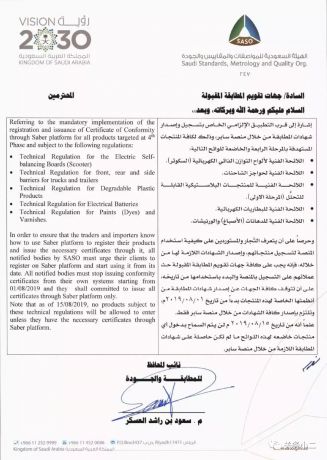 日前,沙特阿拉伯标准组织 SASO(Saudi Standards, Metrology and Quality Organization)再次发布公告,通知了关于最新计划增加的需强制通过SABER系统申请相关证书的5个技术指令下的产品。