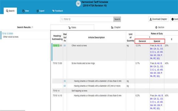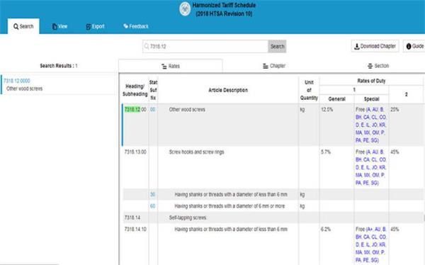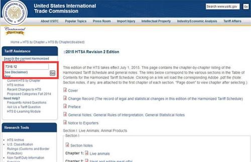 进入上述网站,在Tariff Assistance项下Search the current Harmonized Tariff Schedule...下的搜索框中输入中国HS CODE的前六位数,如木螺钉7318.12****,搜索结果页面的左边框有详细的HTS CODE,根据自己的产品选择HTS CODE。