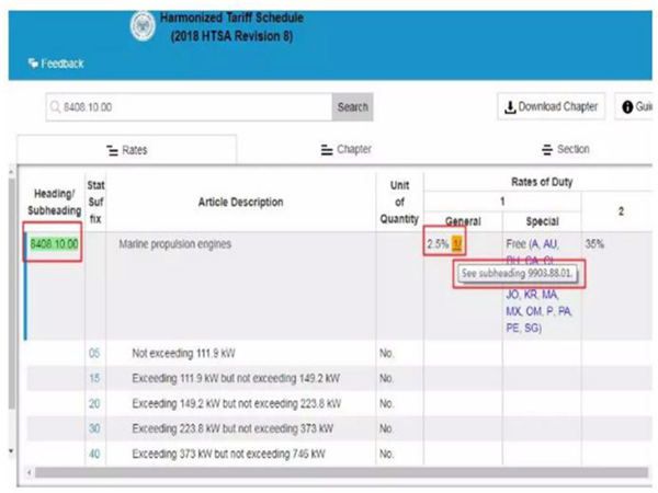 我们以税号为“8408.10.00”的船用推进发动机为例演示,这项产品被列入了160亿美元的加税清单中,此前它的进口税率在“General”处显示是2.5%。但它后面跟着一个“1”,显示让我们再去查看“9903.88.01”这个副标题。