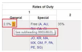 “1”中的“General”指从世界绝大部分进口产品的关税(含中国),“Special”指和美国有相关自贸协定国家的进口关税(经常有free的,可是那不是给我们享受的);