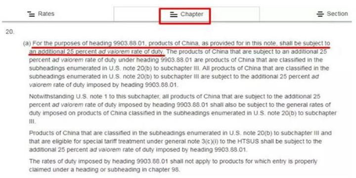 这句话中提及“note 20”是个什么东西呢?在“Chapter”页面下我找到了这个note 20,它是对中国产品加税的一个解释。这里明确说明了,25%是额外征收的税率。下文中也继续列出了归在“9903.88.01”项下的编码。