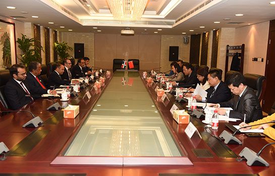 图为国家邮政局副局长赵民与多米尼加驻华大使布里乌尼·加拉维托·塞古拉和多邮政代表团在会谈中。