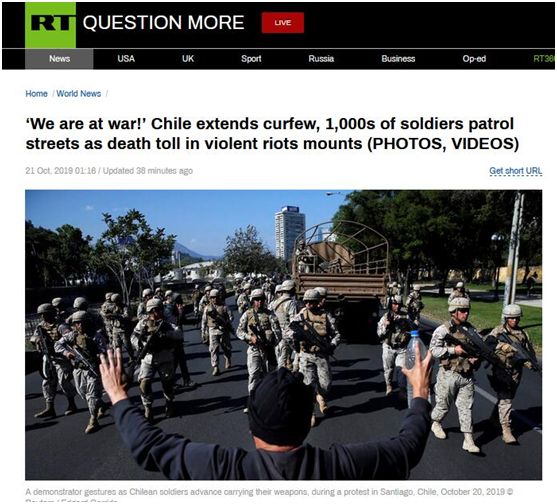 10月20日,智利圣地亚哥,不满政府上调公共交通票价,民众点燃地铁抗议。抗议活动在持续一周后升级,一天内有超过70起严重骚乱,超市遭洗劫纵火,致3人身亡,另有5人在服装厂内因大火身亡,目前已有超过1500人被捕。10月19日,智利总统宣布首都进入紧急状态,军方向首都增派士兵维持社会秩序,为缓解紧张局势,总统表示有意搁置公共交通费上调政策。