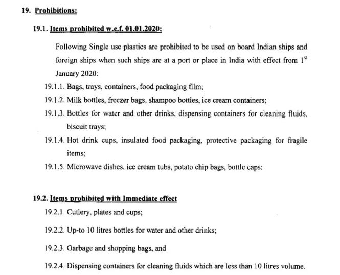 从2020年1月1日起,所有印度船和在印度港口或航经印度水域的船舶禁止使用:包括塑料袋、托盘、容器、食品包装膜、奶瓶、冷冻袋、洗发水瓶、冰淇淋瓶、瓶装水和其他饮料、清洁液分配容器、饼干托盘、热饮杯、保温食品包装、易碎品保护包装、微波炉盘子、冰淇淋桶、薯片袋、瓶盖。
