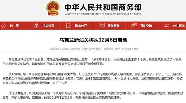 2019-12-6 乌克兰通讯社12月4日消息,乌克兰海关署在社交网站上宣布,“从12月8日起,我们开始全面工作!今天,乌克兰政府通过了一项关于启动新海关的法令。这使新成立的海关署及其各分支机构可以开始全面工作。”