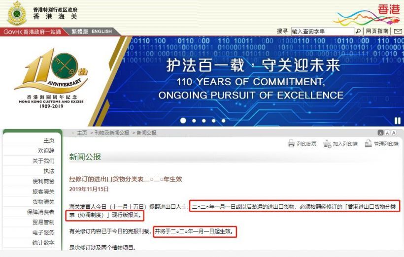 同时香港海关也发布新闻公告:2020年1月1日起,装运的进出口货物,必须按照最新修订的《2020年版香港进出口货物分类表(协调制度)》报关。
