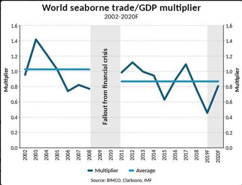 从理论上讲,如果贸易保护主义措施得到遏制,自由贸易再次以自然的速度发展,贸易乘数可能恢复到更健康的水平,给航运业带来好消息。