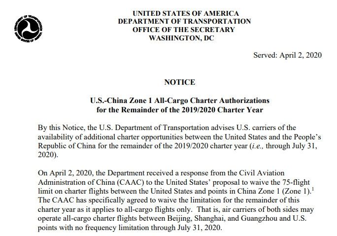 公告称,DOT于4月2日收到中国民航局对美方关于豁免美国与中国1区(包括上海、北京和广州)之间75个航班限制提议的回应。中国民航局特别同意在本包机年剩余时间里豁免这一限制,因为它只适用于全货运航班。也就是说,美中双方承运人均可在北京、上海、广州与美国之间运营全货运包机航班,没有频次限制,直到2020年7月31日为止。
