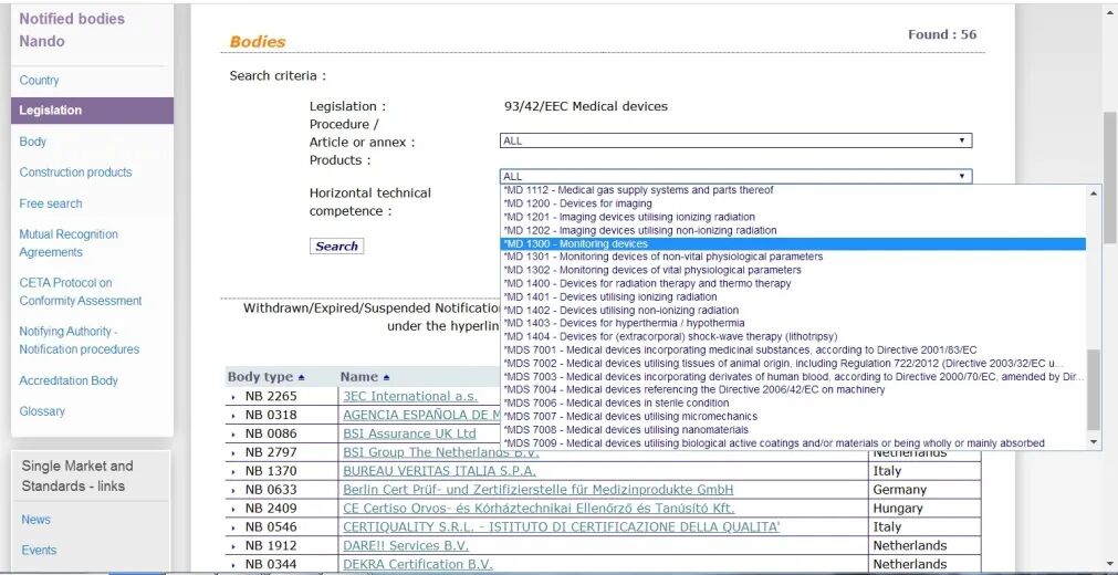 可通过获得授权的公告机构进行查询,欧盟医疗器械指令EU 93/42/EEC(MDD)授权的公告机构查询地址为:https://ec.europa.eu/growth/tools-databases/nando/index.cfm?fuseaction=directive.notifiedbody&dir_id=13。在Products 处选择MD 1300- Monitoring Devices或相关类别。