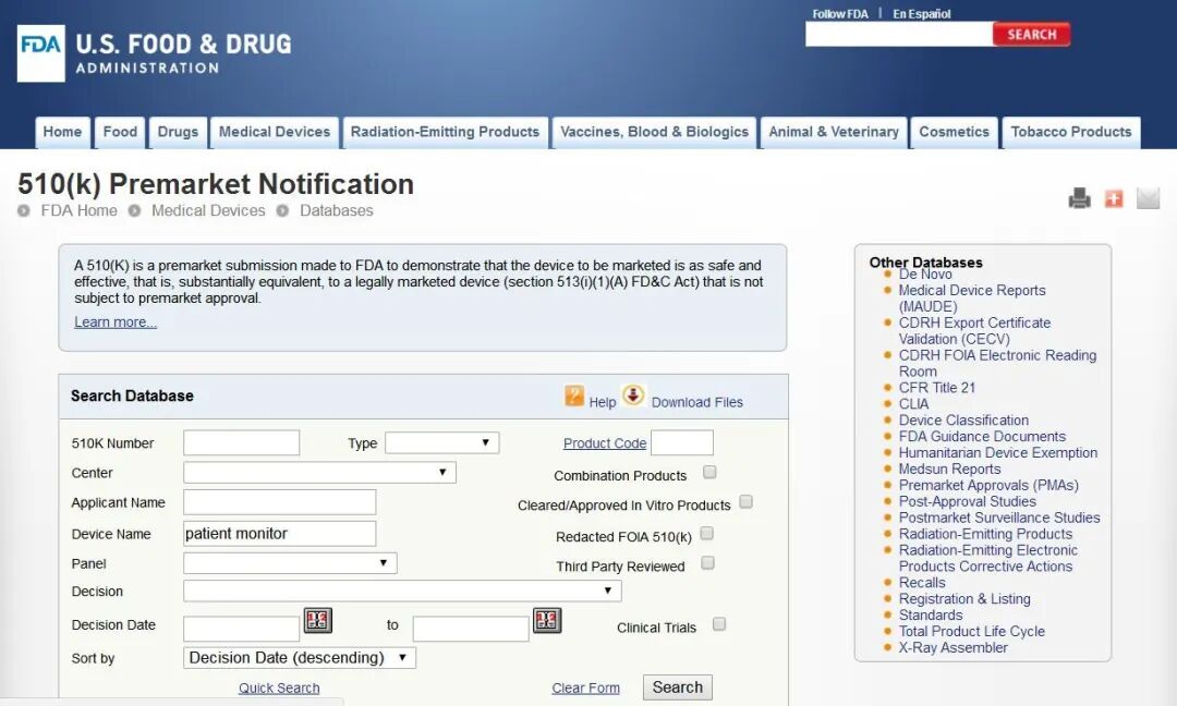 已获得美国FDA准入的产品可以通过其官网查询注册证书号进行查询,链接为:https://www.accessdata.fda.gov/scripts/cdrh/cfdocs/cfPMN/pmn.cfm