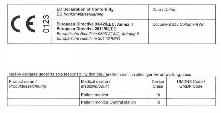 病员监护仪在欧盟属于IIa、IIb类医疗器械,每个合格的产品都必须有一个符合性声明Declaration of conformity,其中标注了产品信息,公告机构信息,符合的法规、标准等。