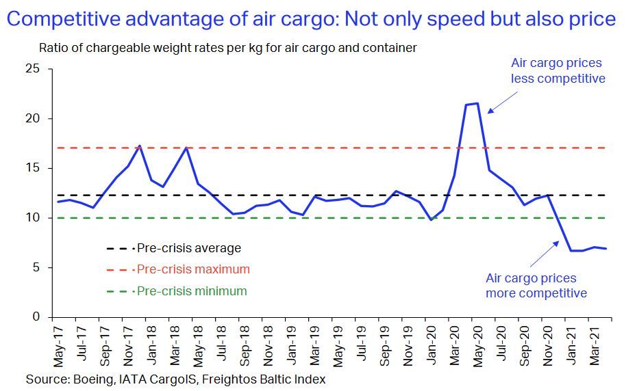 报告指出,航空货运相对于集装箱运输的成本竞争力在最近几个月有所改善,5月份航空货运的平均成本是海运的6倍,而危机前是12倍。