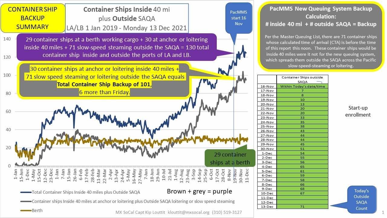 南加州海事交易所(Marine Exchange of Southern California)的最新数据显示,目前有101艘集装箱船滞留,其中30艘停泊或游荡在南加州水域内,71艘缓慢航行或游荡在指定的安全和空气质量区域之外。