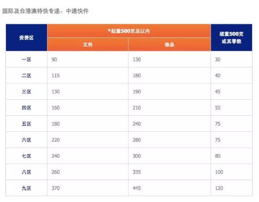 看上图我们可以知道,美国是5区,也就是说到美国快递用EMS寄500克一斤的文件起价是180元,而寄500克的物品则是240元。