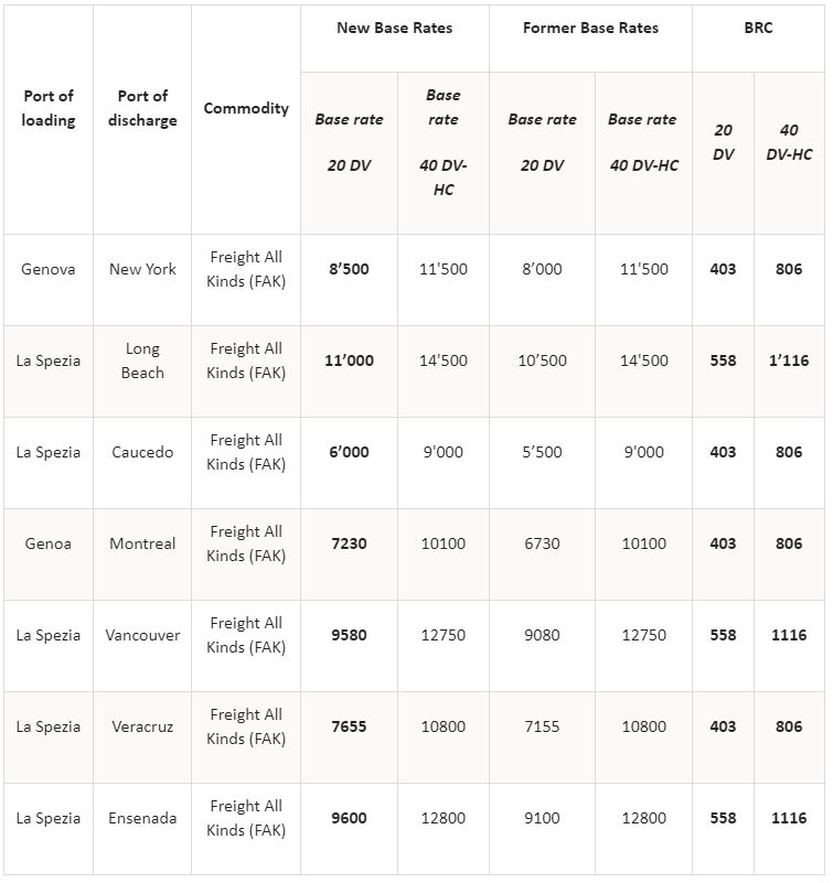 特别是,瑞士/意大利航运公司将对拉斯佩齐亚和热那亚港口的货物实施FAK费率上涨,这些货物将运往美国纽约港口,以及墨西哥的长滩、韦拉克鲁斯和恩塞纳达,考塞多多米尼加共和国,以及加拿大的温哥华和蒙特利尔港口。
