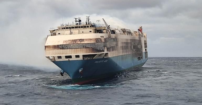 在2月16日22名船员被疏散后,位于大西洋的2005年建造的汽车航空母舰Felicity Ace上的大火仍在继续燃烧。葡萄牙海军拍摄的照片显示,这艘船及其货舱受到了严重损坏。