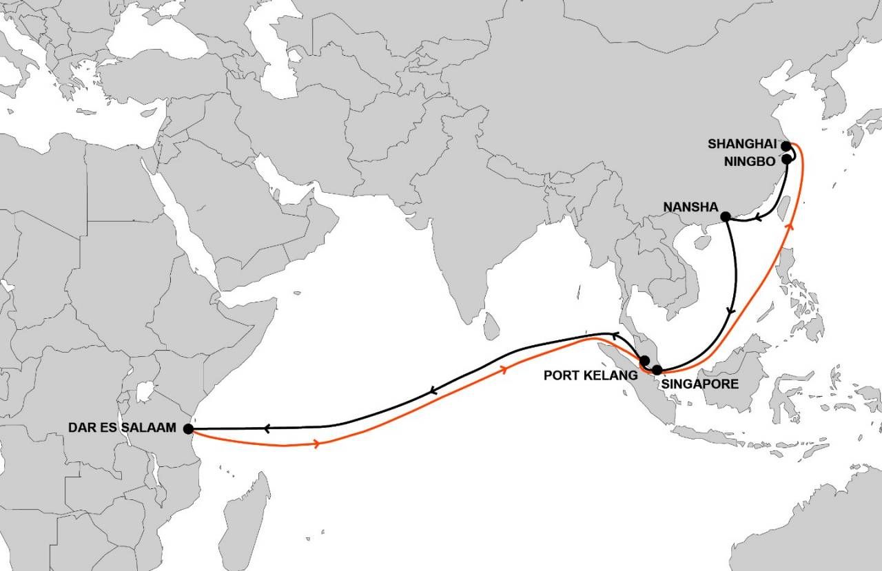 上海——宁波——南沙——新加坡——巴生港——达累斯萨拉姆——巴生港——新加坡——上海