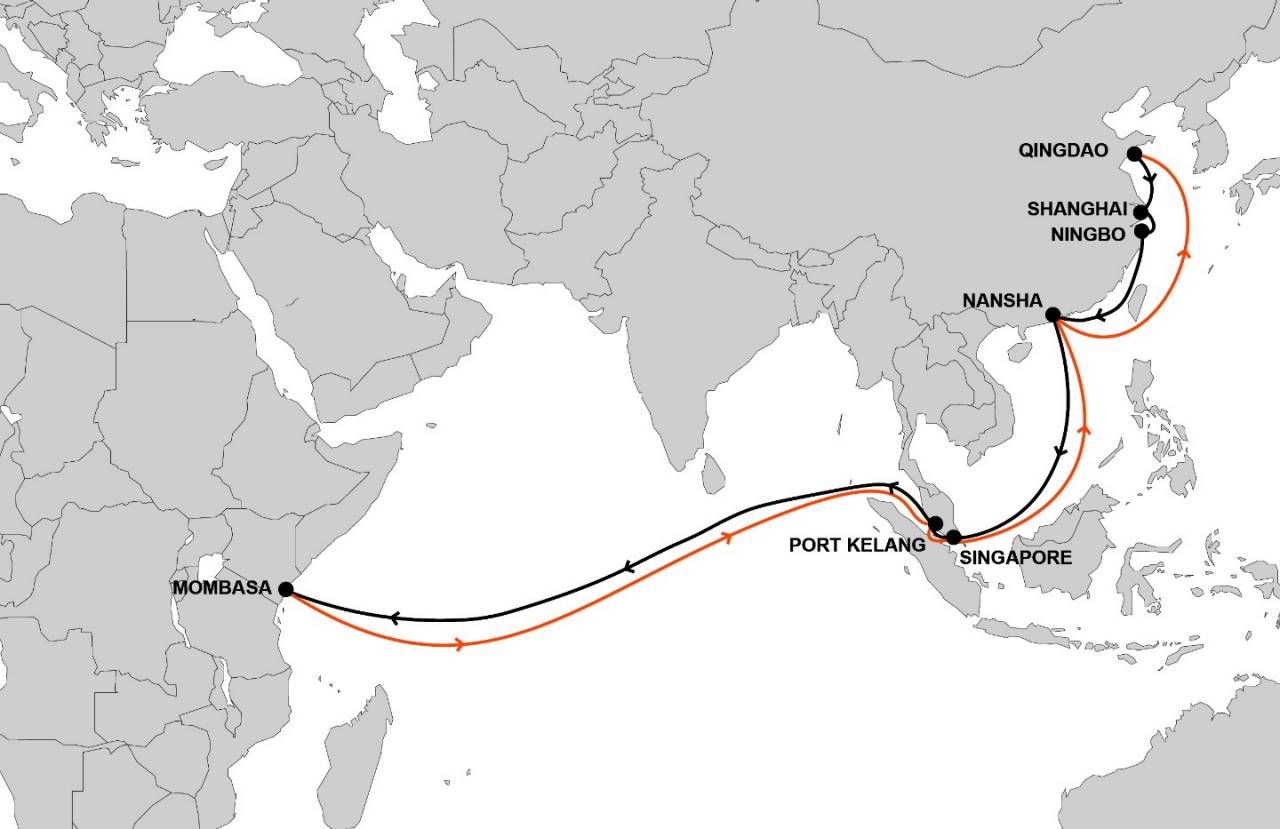 青岛——上海——宁波——南沙——新加坡——巴生港——蒙巴萨——巴生港——新加坡——南沙——青岛