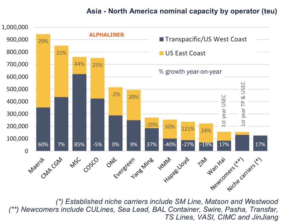 亚洲至北美集装箱贸易航线调查显示,2M 的合作伙伴 MSC 和马士基是增长最快的承运人,这两个船司都推出了许多独立环路,而不是其联盟协议的一部分。