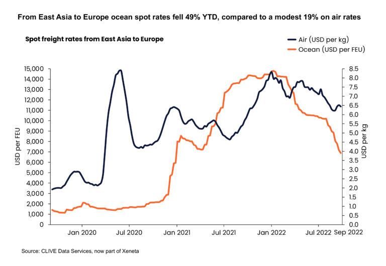 9月份,从东亚到欧洲的海运现货价格较1月份下降49%,而空运现货价格则下降19%。