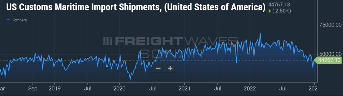 FreightWaves SONAR关于美国海关进口货物的数据集同样显示,情况已恢复到大流行前的状态。现在出货量回到了2019年的水平。
