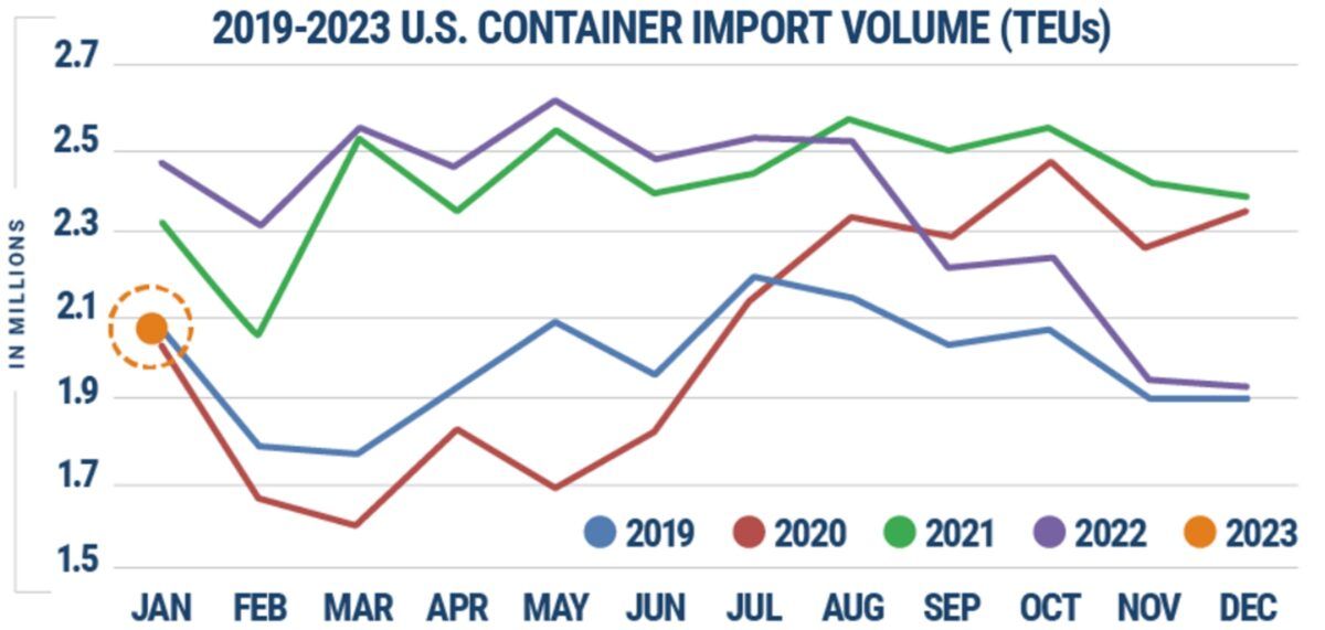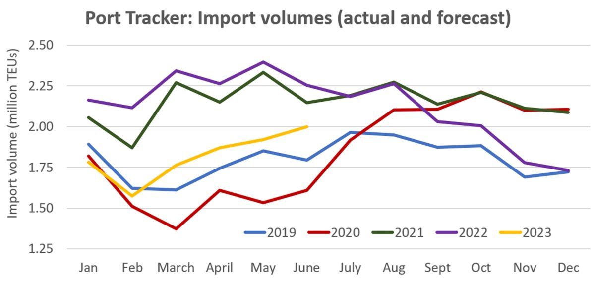 Port Tracker刚刚下调了2023年初的预测。周二,该机构将1-5月进口预期较一个月前公布的预期下调了3.5%。