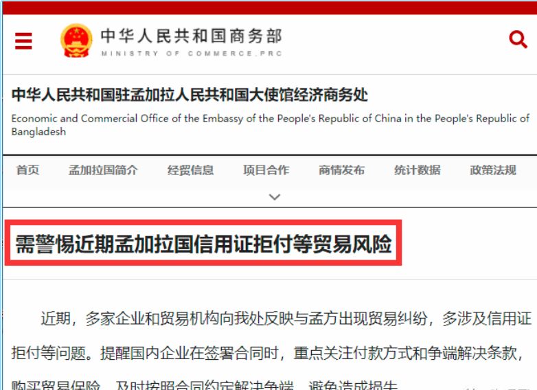 日前,中华人民共和国驻孟加拉人民共和国大使馆经济商务处发布安全风险提醒:近期,多家企业和贸易机构向我处反映与孟方出现贸易纠纷,多涉及信用证拒付等问题。提醒国内企业在签署合同时,重点关注付款方式和争端解决条款,购买贸易保险,及时按照合同约定解决争端,避免造成损失。