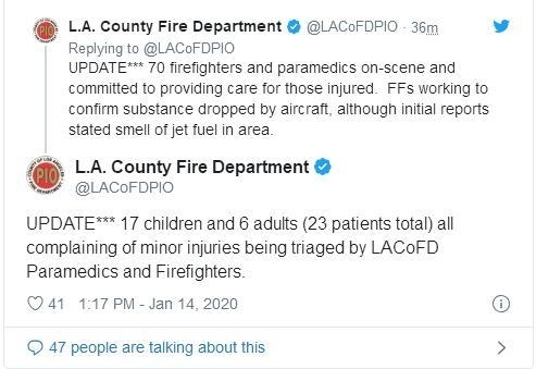 洛杉矶消防局在推特上发文称,现场有70名消防员和护理人员,消防员正在对加州郊区城市卡德希的这所学校的“多名病人”进行评估和护理。